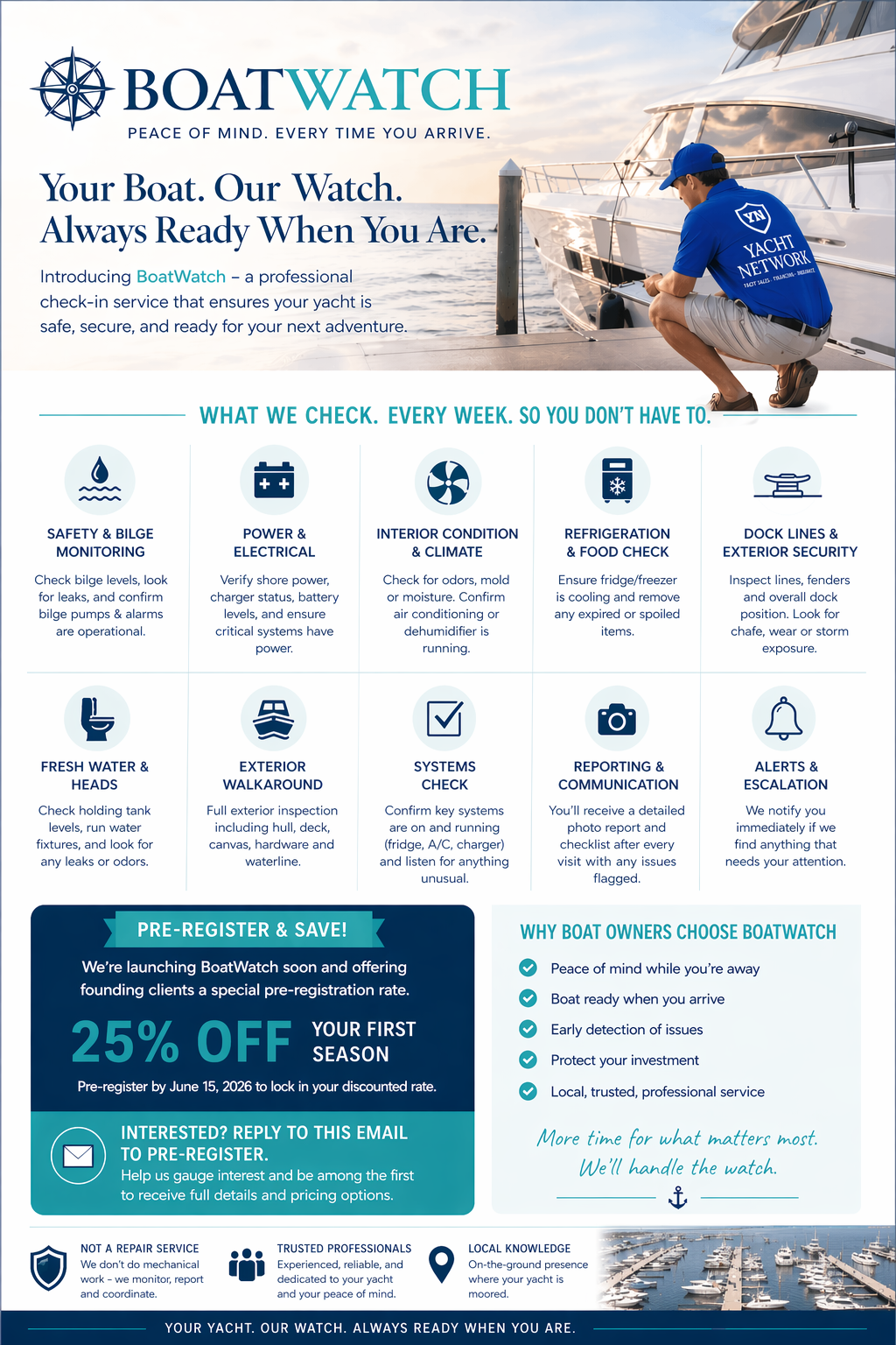 BoatWatch offers professional weekly check-in services to ensure your yacht remains safe, secure, and ready for your next adventure. Be the first to pre-register and get info first to lock in a 25% discount on your first season.