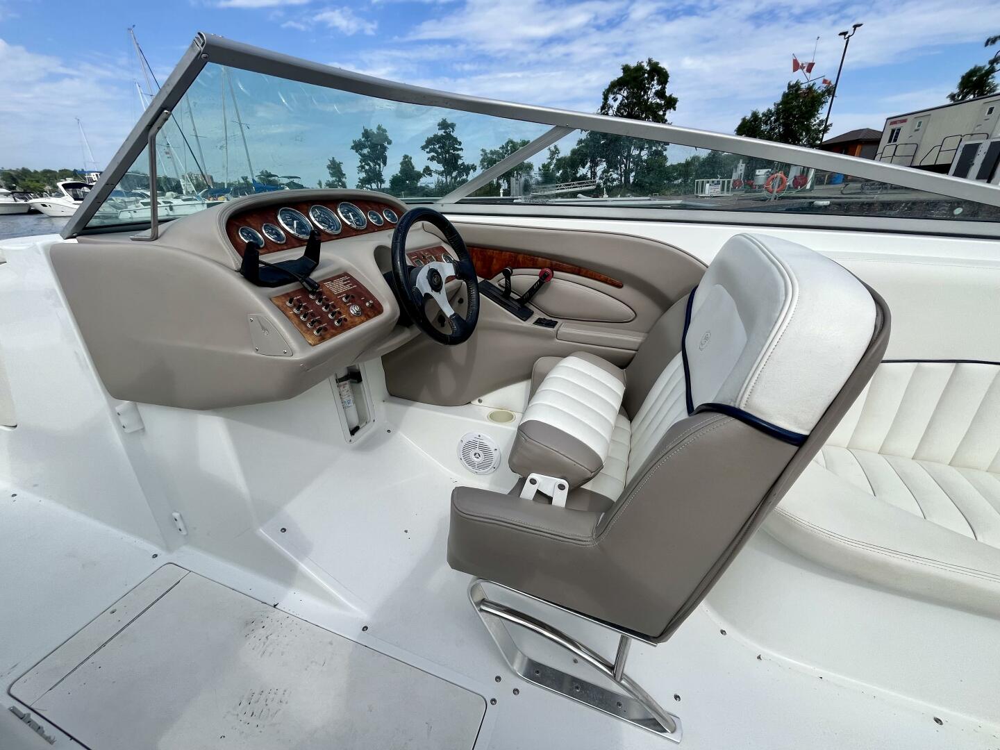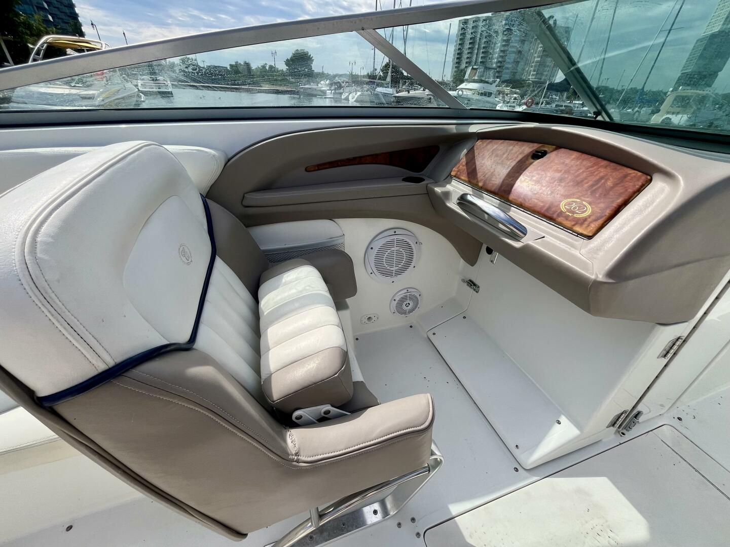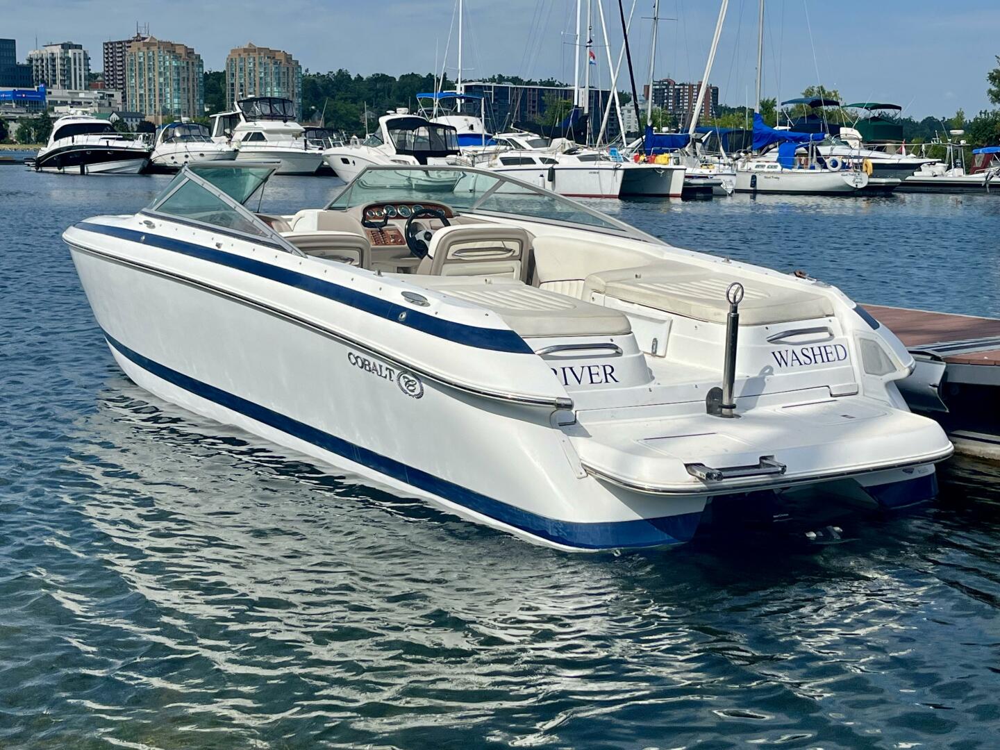 The Cobalt 262 is a radical blend of traditional Cobalt craftsmanship in the service of a bold, modern look. The 262 arrives with a sharper deadrise, reverse chines, and all-composite construction in an aggressive profile that suggests the performance of the 262's high-end power options. The Venetian lines of the 262 sweep in the style of the limousine speed boats common to European waters. Configured around a wrap-around lounge, the cockpit is roomy and comfortable. The head compartment hides beneath lustrous wood trim at the console. With a walk-through transom and teak extending to the cabin's edge, the activity platform has become an intrinsic part of the floor plan. The stunning Bimini Arch is optional.