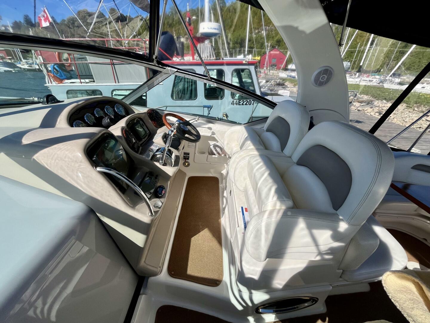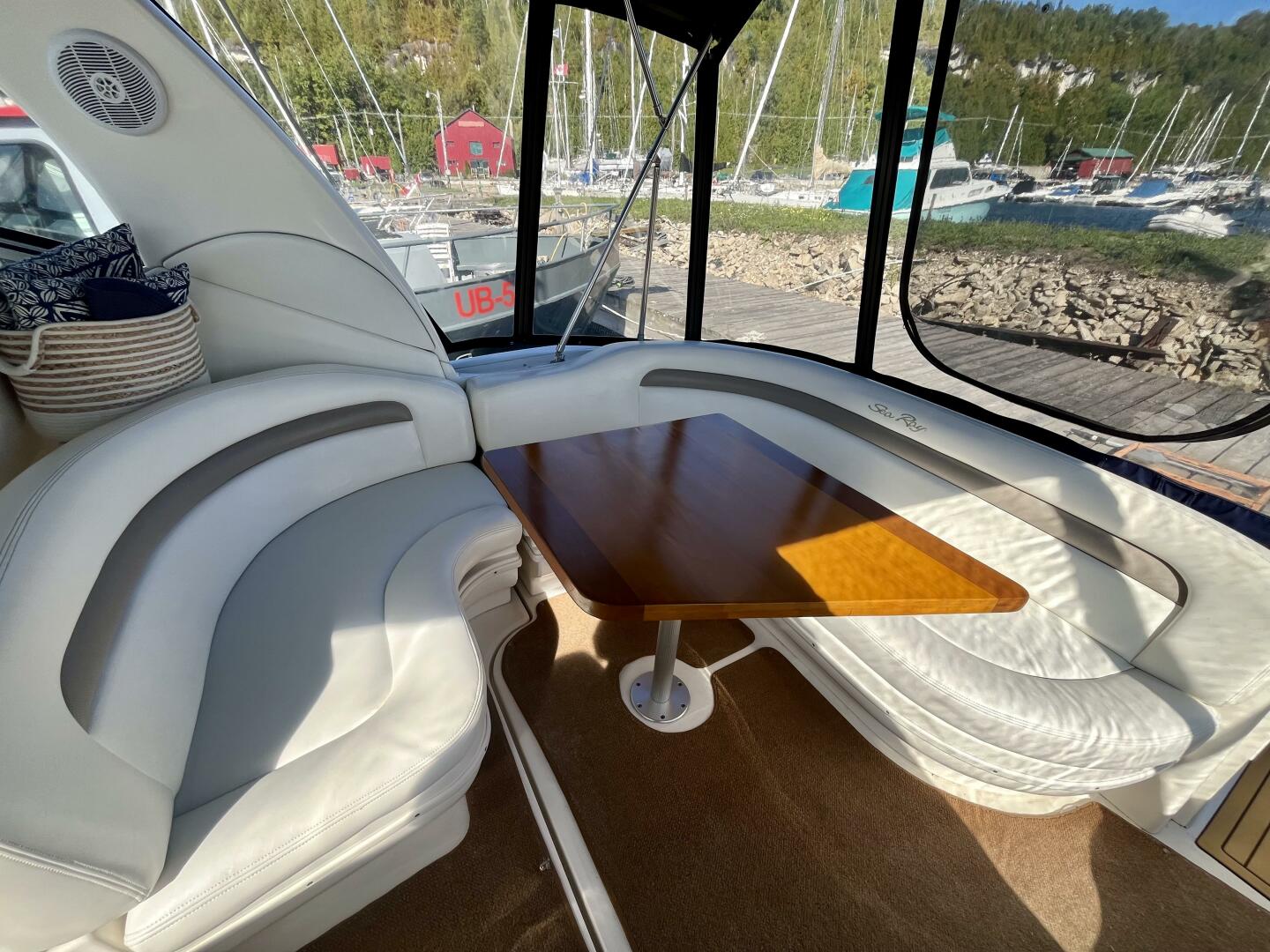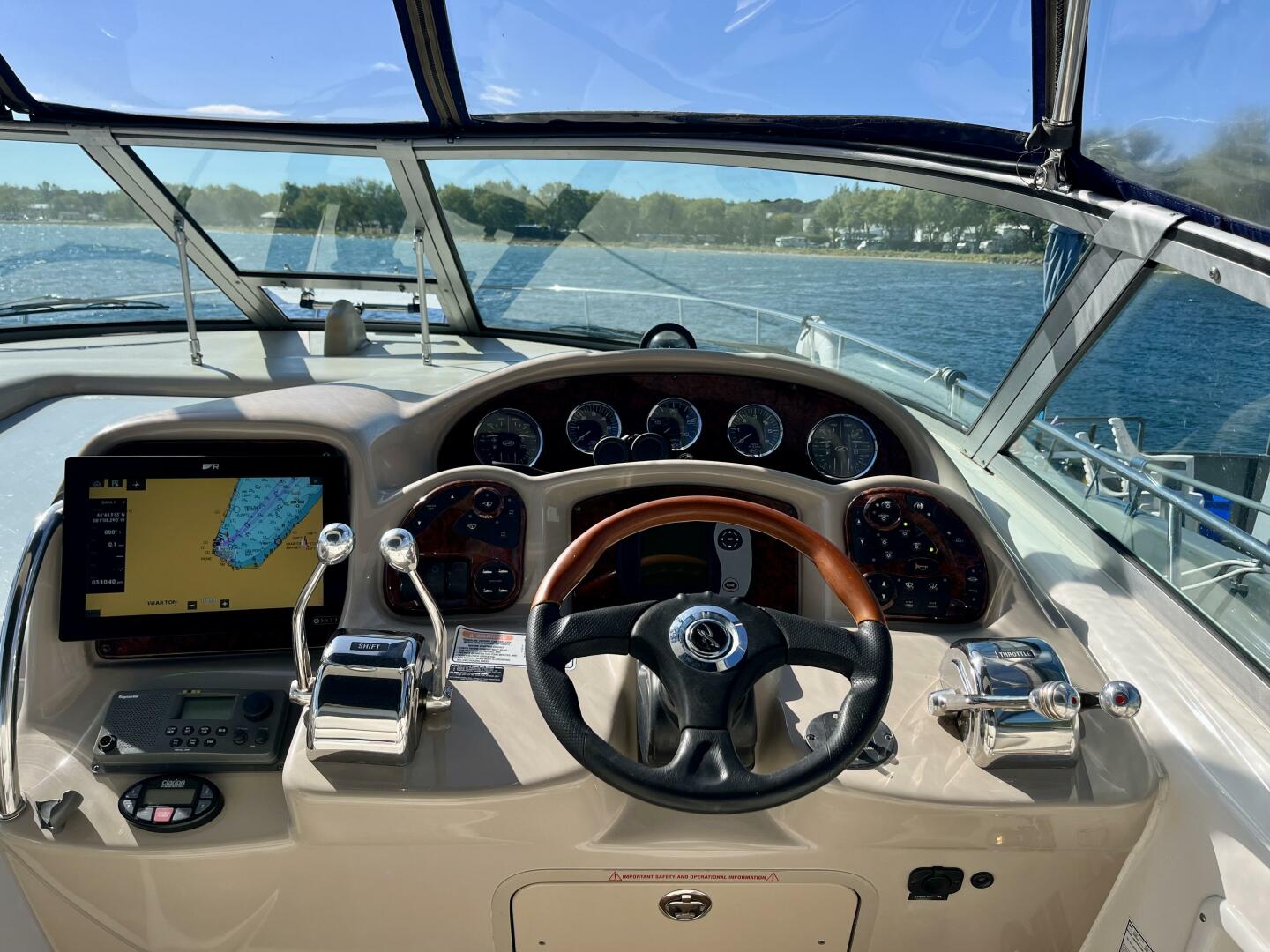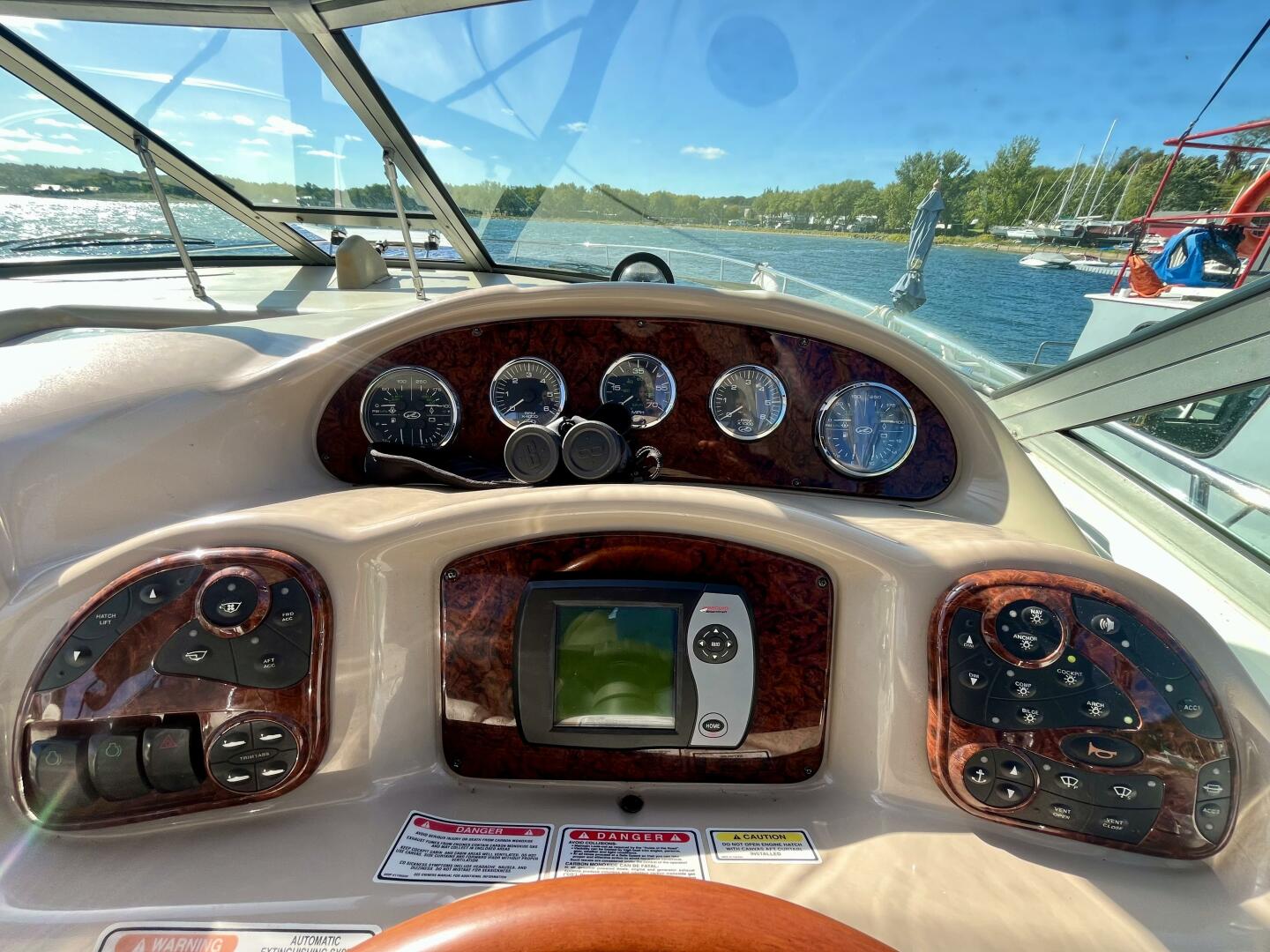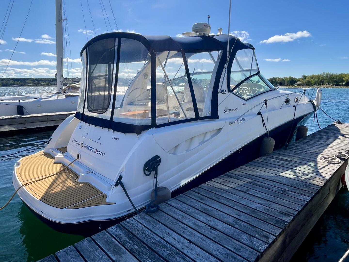The 2004 Sea Ray 340 Sundancer packs luxury and performance into a perfectly sized express cruiser for weekend getaways or extended cruising. This example features the highly desirable engine upgrade to the twin 496 cubic inch or 8.1 litre MerCruisers providing a whopping 740 horsepower making light work out of propelling the Sea Ray up to speeds about 30 knots (56 kph) while widening the smiles of it's passengers. The enjoyment continues throughout the spacious cockpit with seating for six, an integrated swim platform with Sea Decking for easy water access, a wet bar with fridge and waterside dining table under a full enclosure while music fills the space from the surround stereo. Below deck, you've got a Queen island bed up front, a double in the aft and another convertible double in the salon providing comfortable accommodations for 6 overnight. There's a full galley with a Corian countertop, microwave, stove and another fridge all across from the Head with hot water shower. This Sea Ray 340 Sundancer is perfect for weekend getaways or family cruises with 225 gallons of fuel for long range, air conditioning and onboard generator for comfort, premium electronics, like smart craft diagnostics, radar and upgraded touch screen chartplotter, even colour matched dock lines... she is reliable, stylish, and ready for adventure!